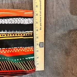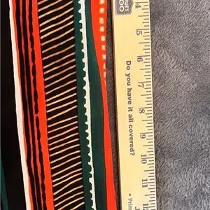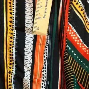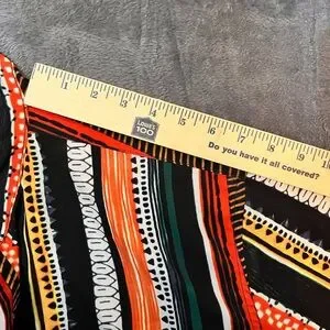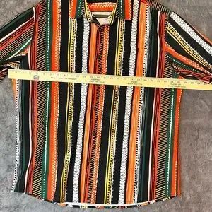 XL casual short sleeve button-up shirt with bold vertical stripes. Features black, orange, green, yellow, and white colorway for a vibrant look. Lightweight and breathable fabric for all-day comfort. All measurements in pictures including front pocket.