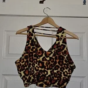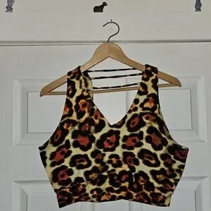 Eye-catching leopard print bralette in yellow, black and rust tones. buttery soft stretchy knit for a comfortable fit. V-neck with strappy back detail for a stylish look. Great for layering or wearing solo for a bold statement.