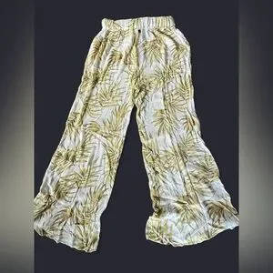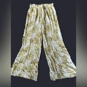 Elevate your style with these chic leaf print wide-leg pants. Perfect for any occasion, these cream and green pants offer comfort and elegance.