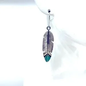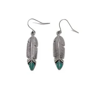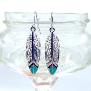 Boho Festival silver tone feather earrings with turquoise blue tips