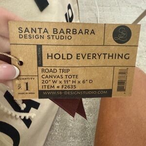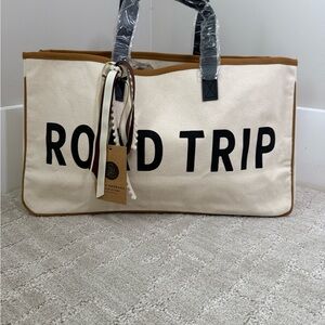 This chic tote bag features a bold 'ROAD TRIP' print, perfect for your next adventure. The white canvas is complemented by tan accents, offering a stylish and versatile look.