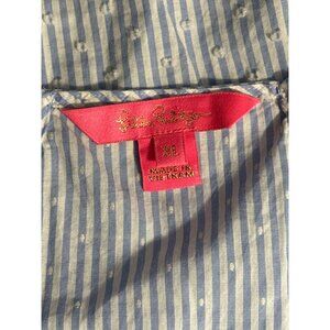 This Lilly Pulitzer tank top features a delicate blue and white striped pattern with subtle textured polka dots and charming ruffle trim details. The lightweight fabric and adjustable spaghetti straps ensure comfortable wear, making it an elegant choice for warm weather or layering. Crafted with care in Vietnam, this XL top showcases a relaxed fit and timeless design.