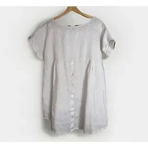 This woman's Terzo Millennio short cap sleeve blouse with a hi-low hem and decorative buttons in the back is preowned and in great condition. This has light wear. The color is a sand and the top is 100% linen. This is machine washable. The approximate measurements are: