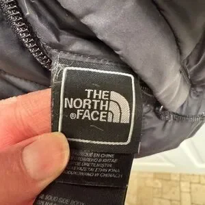 Sleek gray puffer jacket by The North Face. Features durable stitching and warm insulation.