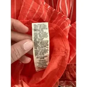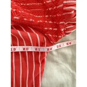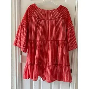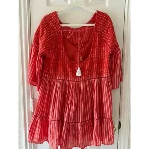Capture effortless bohemian charm with this enchanting Free People mini dress. Intricate embroidery graces the neckline and sleeves, leading to a flowing tiered skirt that sways beautifully with every movement. Delicate white stripes on a vibrant coral backdrop create a lively yet sophisticated pattern, while the tassel tie at the back adds a playful touch. Perfect for sunny days at a music festival, a relaxed beach vacation, or a casual brunch with friends.