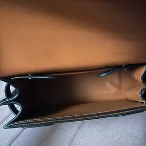 Sammy Coach bag in black leather with a gold 'C' clasp on the front. You can lock and unlock this bag with the key that’s included in the holder attached to the side of the bag. Has a top handle and comes with a detachable long strap for versatile carry.