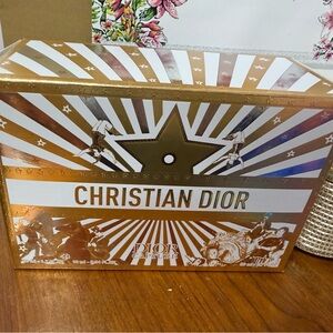 Dior cosmetic pouch with woven textured exterior. Features a gold-tone signature CD emblem on front. Zip closure for secure storage. Sleek neutral style for travel or vanity.