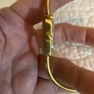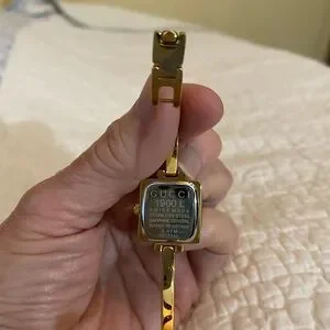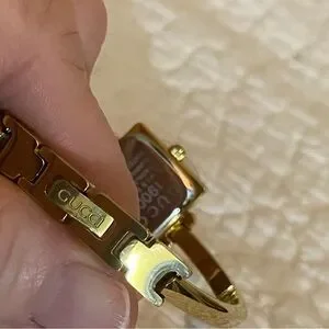 Gold bangle watch with a square Mother of Pearl face. Gold-tone finish. New and working. Still has plastic on face.