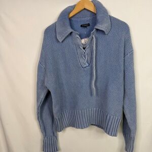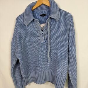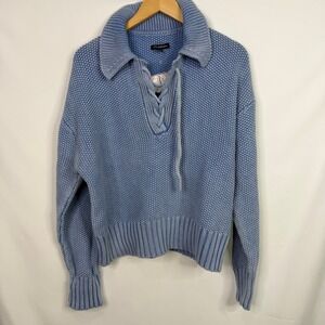 Keywords: Chunky Knit, Cotton Sweater, Lace Up, Collared, Coastal, Boho, Relaxed Fit, Fall Fashion, Winter Layering, Blue Pullover