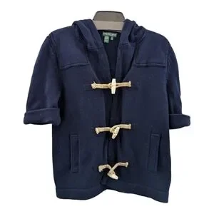 Step up your fashion game in this nautical-inspired navy hooded sweater from Lauren Jeans Company! Made with the perfect blend of comfort, quality, and style, this small size piece is a must-have for spring and summer.