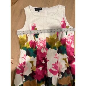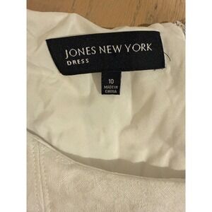 Jones New York sleeveless fit and flare dress features a vibrant floral print in shades of pink, green, and gold over a white textured jacquard background. Constructed from a structured cotton blend with a hint of stretch, this knee-length piece includes a classic round neckline, a concealed back zipper, and a full pleated skirt for a feminine silhouette. The interior is fully lined for comfort and a polished finish.