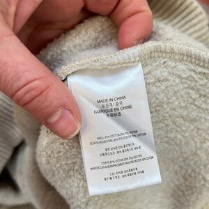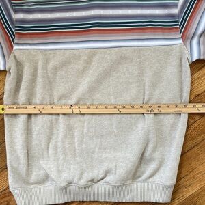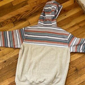 Soft beige pullover hoodie with striped hood and sleeves. Front kangaroo pocket and adjustable drawcord. Casual relaxed fit with buttoned neckline detail. Colorful stripe accents add a Western-inspired touch.