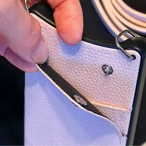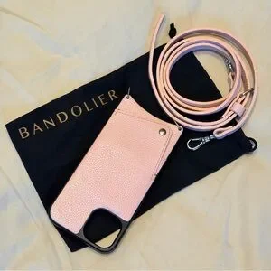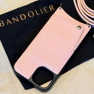 Bandolier pink leather phone case with a matching adjustable crossbody strap. Secure card pocket and easy access to phone while on the go. Stylish pink design that converts your device into a hands-free accessory.