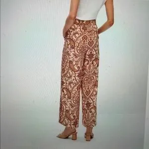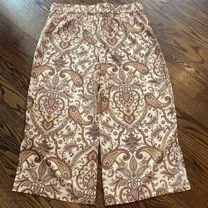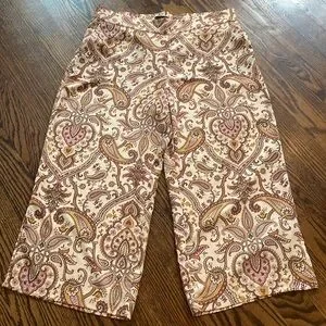 Melanie Lyne sz 14 Wide leg flowy cropped pants w paisley print brown pink gold