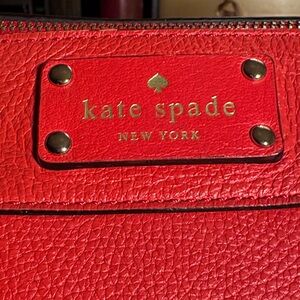 Bright red leather shoulder bag featuring a gold-tone kate spade logo plate. Textured pebble leather with clean, structured styling. Classic silhouette for everyday or dress wear.