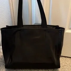 Sleek black tote from kate spade. Nylon exterior with streamlined silhouette. Dual shoulder straps for easy carry. Subtle logo detail at front. Practical and chic for daily use.