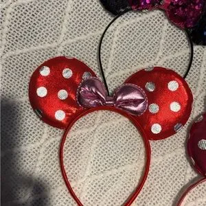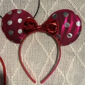 Set of Minnie Mouse ears headbands in red and pink with polka dots and bows.