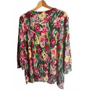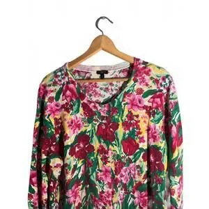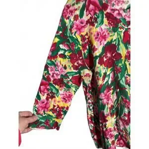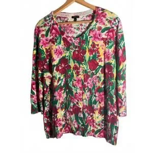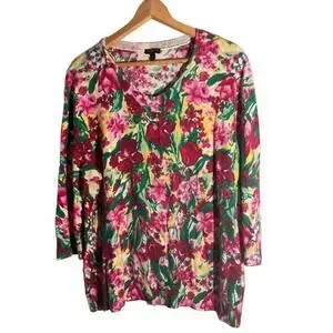 Brighten your wardrobe with this lovely Talbots sweater featuring a colorful floral print in shades of pink, red, green, and yellow. The cardigan with long sleeves make it a versatile piece for layering or wearing on its own. Perfect for spring and summer casual outings or adding a pop of color to your everyday look.