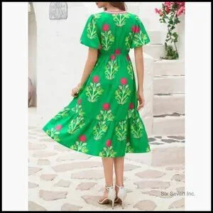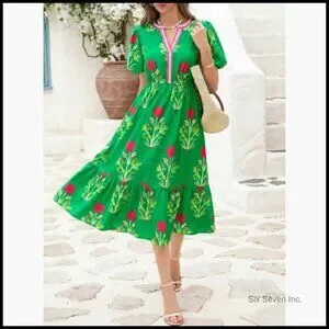 A stunning summer dress with a flowy A-line silhouette, designed for comfort and style. Features puff short sleeves and a V-neck, perfect for casual outings, beach vacations, and travel.