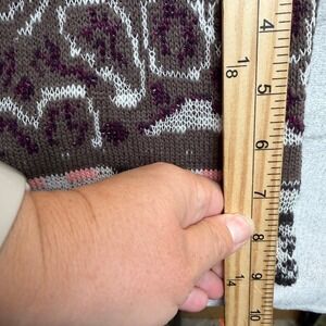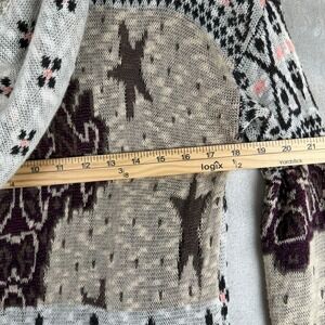 Bohemian open-front duster cardigan showcases an intricate mixed-media jacquard knit with a blend of geometric, floral, and celestial star patterns. This longline layering piece is crafted with a cozy hood and slim-fitting long sleeves, featuring a rich palette of burgundy, cream, brown, and subtle pink accents. The lightweight yet warm knit construction makes it an ideal choice for transitional weather or adding a free-spirited touch to a casual ensemble. Please note a minor snag in 3 places on the sleeve as shown in the detail photos. Have reduced price due to this. It's a light sweater.