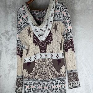 Indie Boho Free People Hooded Duster Cardigan Burgundy Knit Star Long Sweater S