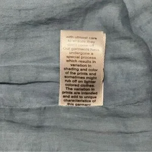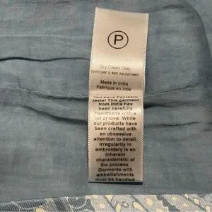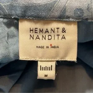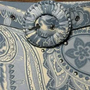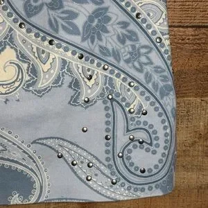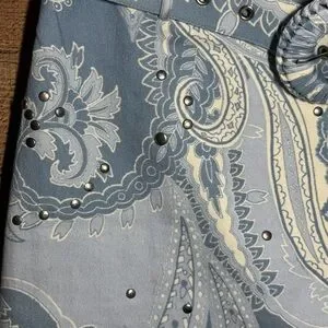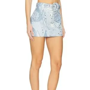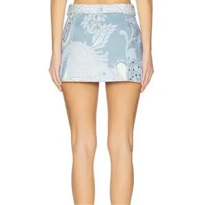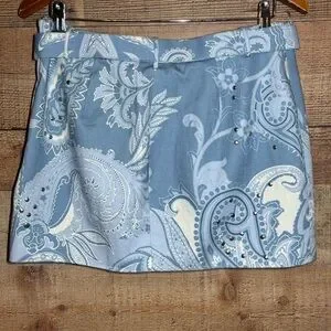 Hemant & Nandita Buckle Belt Studded Mini Skirt size Medium in a powder blue and cream paisley print with silver tone studs. Hemant & Nandita blends pop details with casual sophistication, depicting an extreme attention to detail. The designs are an exciting amalgam of prints and embroideries with balanced placements. Development of fresh and new prints with detail and exploring different surface techniques provides the right amount of experimentation and sophisticated elegance to the brand aesthetic. Hidden side seam zipper, fully lined, with detachable belt. Dry clean only. Pre-loved condition.