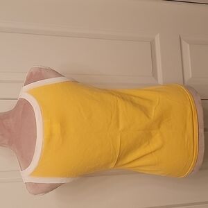 So bright and cheerful sleeveless yellow and white top in 55% rayon 45% nylon. Very cute style. Great for summer! Size M