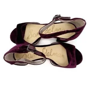 Sam Edelman “Susie” velvet ankle strap block heel sandals in rich burgundy. Elegant open toe style, size 6.5, perfect for holiday or evening wear.