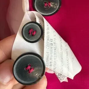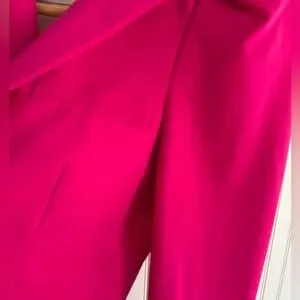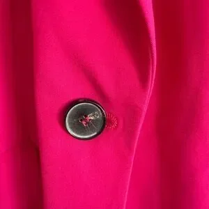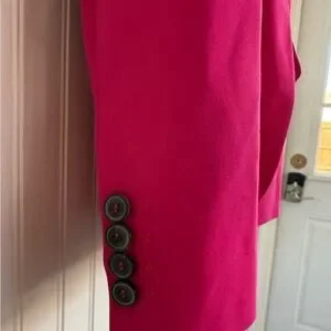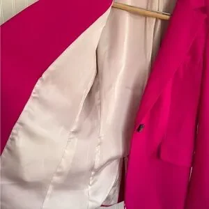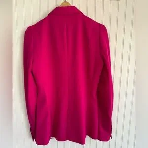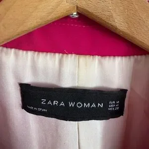 Zara tailored blazer size medium with single-button closure. Notch lapel and structured shoulders. Flap pockets and clean lines. Bold fuchsia hue for standout style. In good condition but please note in photos: some imperfection on buttons, mild discoloration near armpits, some discoloration on the inner neckline.