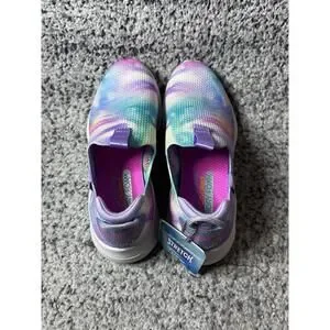 The product is a pair of SKECHERS Ultra Flex 3.0 slip-on sneakers for girls in a vibrant multicolor design. They are in size 3 for US. The sneakers feature a glitter accent and the SKECHERS logo on the upper textile material. The slip-on style provides convenience for quick and easy wear, making them ideal for active girls looking for both style and comfort in their athletic footwear.