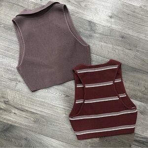 Two sleeveless knit tops by Babaton. One mauve cropped polo with a ribbed texture and V-style collar.