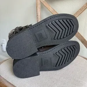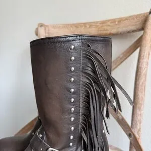 classic, half-calf boot from Frye, complete wiht fringe trim, studded accents, and buckle straps for the perfect moto-inspired pair.