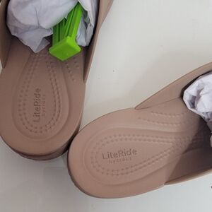 Classic two-strap Crocs slide sandals. Smooth taupe straps with adjustable buckles. Comfortable molded footbed. Neutral, versatile color.