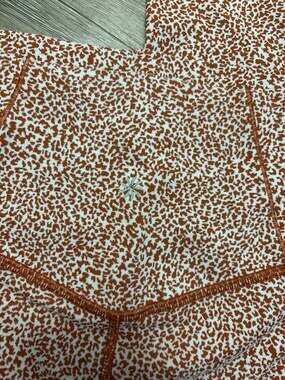 Athleta Salutation Stash II Textured Tight in a stylish rust orange and white animal print leopard pattern. These high-waisted leggings feature side pockets to hold your phone or essentials during your workout. Made with a buttery-soft, supportive fabric blend of polyester, nylon, and spandex that is perfect for yoga or gym sessions.