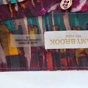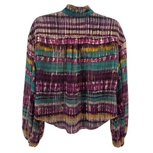 Keywords: Ramy Brook, multicolor blouse, striped top, pleated sheer, mock neck, button front, voluminous sleeves, elegant, sophisticated, romantic, chic, evening wear, resort wear, designer, statement piece