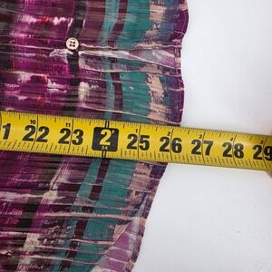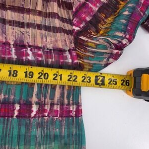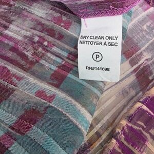 Radiate confidence in this stunning Ramy Brook New York blouse. The captivating multicolor striped pattern, rendered in a sheer fabric with subtle pleating, creates a mesmerizing visual effect. The elegant mock neckline and button-front closure add a touch of sophistication, while the voluminous sleeves with elasticated cuffs lend a romantic flair. Perfect for a chic dinner date or a stylish evening out.