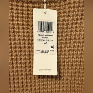 NWT This sweater by Eileen Fisher features waffle knit dimensional texture - plush and luxurious to the touch. Crew neck with drop shoulders and ribbing on neck, cuffs, and hem. Crafted from recycled cashmere and wool ( 75% recycled cashmere and 25% wool). Recycled cashmere is made from yarn respun from fine Italian fabrics. Color is Honey