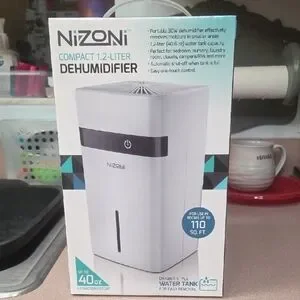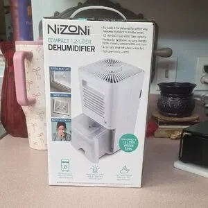 Nizoni compact 1.2-liter dehumidifier in white. Efficiently reduces moisture in small rooms up to 110 sq. ft. Easy one-touch control and automatic shut-off when the tank is full. Quiet, portable design ideal for bedrooms, closets, and laundry areas.