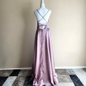 Graceful and feminine full length dark pink satin dress with spaghetti straps and cowl neckline. Two pleats at front waist, split hem skirt. Open back with corset ties.