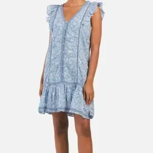 Lucky Brand Lace Trim Ruffle Shoulder Flounce Floral Mini Dress, Light Blue and White