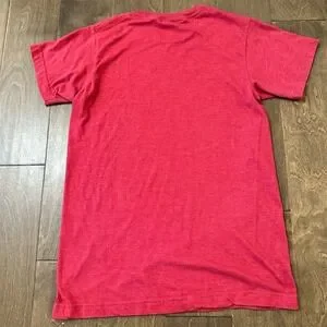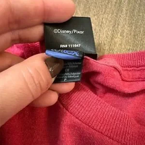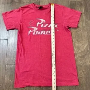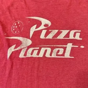Add a touch of magic to your wardrobe with this Disney Toy Story Pizza Planet T-Shirt. Perfect for fans of Buzz Lightyear and Woody, this vibrant red tee features a playful graphic print that captures the fun spirit of the beloved movie. With its comfortable crew neck and short sleeves, it's ideal for casual outings, movie nights, or theme park adventures. Made from a soft cotton-polyester blend, it offers a regular fit for all-day comfort. This officially licensed piece is machine washable for easy care. Pre-owned and ready for a new adventure.