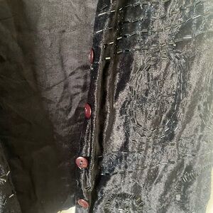 Add a vintage-inspired touch to your look with this stunning black vest by DIIK. Features intricate beadwork and a stylish open front with pointed hem. Fully lined and brand new with tags!