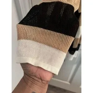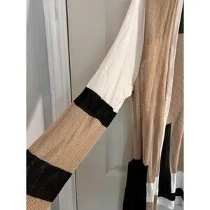 Womens Chicos open-front mesh knit cardigan featuring a neutral color-block design in cream, tan, and black. Lightweight knit makes it a perfect layering piece for spring, summer evenings, or office wear.