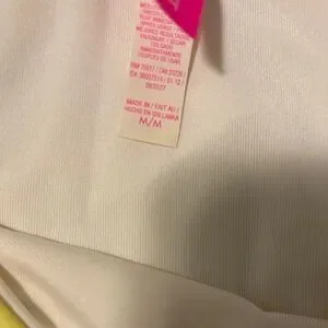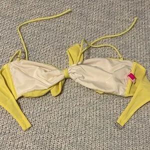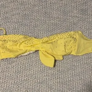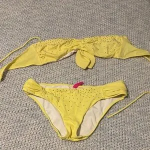Chic yellow bikini adorned with sparkling rhinestones. Ideal for beach outings. The bottoms are a Medium and the top is a Large.