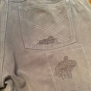 These unique pants feature mixed fabric patchwork, visible mending details, and distressed accents for a vintage-inspired, handcrafted look. The waistband includes a contrast bandana-print lining and adjustable back tab for fit.