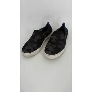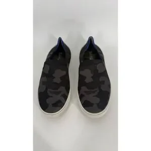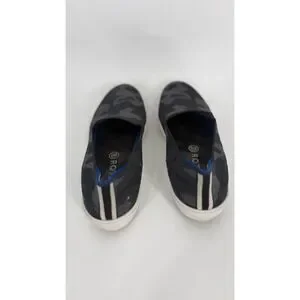 Stylish and sustainable Rothy's camo slip-on sneakers made from the brand's signature recycled knit material. These lightweight shoes are breathable, flexible, and designed for everyday comfort. The gray and black camouflage pattern gives them a modern casual look while the easy slip-on design makes them perfect for travel, errands, and daily wear.