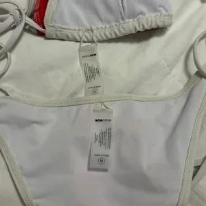 Two-piece white string bikini. Triangle top with one floral-print cup. Matching tie-side bottoms with floral-print front panel. Lightweight swim fabric and adjustable ties. NWOT