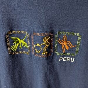 tags: peru, embroidered, souvenir tee, travel shirt, graphic t shirt, unisex, oversized, cotton, vacation, tourist, latin america, boho casual, streetwear, novelty tee, navy blue