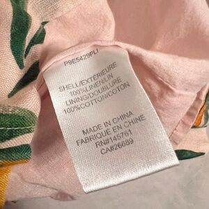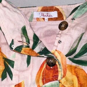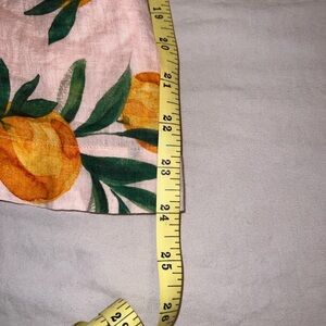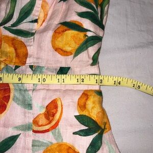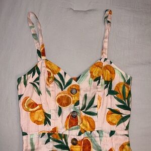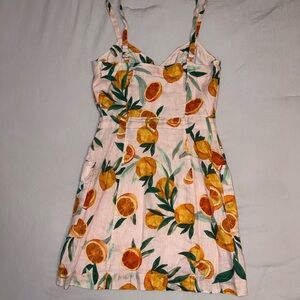 EYC dress. Linen, not stretchy. Has two layers, no see through. Absolutely adorable citrus print. No flaws that I can see. Adjustable straps, see pics for measurements. Has cute cutout above waist. Button and clip closure at chest, see pics.