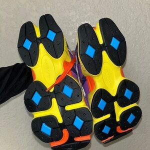 This 9060 New Balance model has a body that is composed of a variety of mesh and plastic materials. There are multiple bright colors featured, including purple, orange, yellow, and blue. There are also a few light touches of Pastel Green that can be seen on the heel. On top of the body, there are bright orange shoelaces, as well as a New Balance logo in the same orange on the tongue.